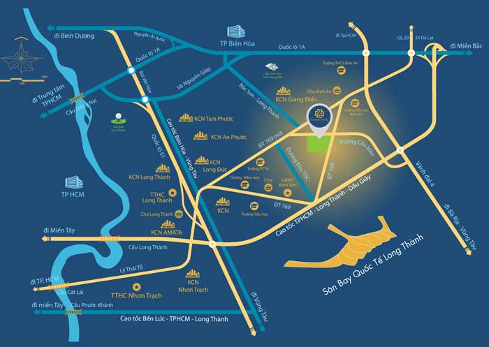 Tiện ích liên kết: TTHC Long Thành; chợ Bình Sơn, chợ Long Thành; Vincom Plaza; khu du lịch sinh thái Thác Giang Điền, sân golf Long Thành; Bệnh viện Shing Mark; Amata City, khu công nghệ cao Techno Park Việt Nam - Hàn Quốc...