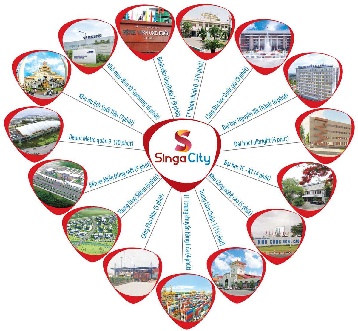 Nằm ngay trung tâm quận 9, Singa City được thừa hưởng rất nhiều dịch vụ tiện ích đáp ứng mọi nhu cầu của cư dân, từ văn hóa - giáo dục, y tế, thương mại - dịch vụ, cho đến vui chơi - giải trí. Từ Singa City, chỉ cần vài phút di chuyển là tiếp cận ngay trung tâm hành chính quận 9, chợ Long Trường, khu công nghệ cao quận 9, Làng đại học quốc gia TPHCM, Bến xe Miền Đông mới, Bệnh viện 15 héc ta, Bệnh viện Ung Bướu 2, khu du lịch Suối Tiên, khu du lịch The Boat Club Residence, Depot Suối Tiên, khu phức hợp OneHup Sài Gòn, Đại học Fulbright, khu liên hợp TDTT Rạch Chiếc,….