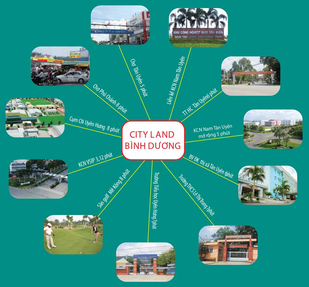 Cityland Bình Dương còn liền kề các khu đô thị – công nghiệp lớn: KCN Nam Tân Uyên mở rộng, Sóng thần 3, VSIP 3, chợ Tân Uyên. chợ Quang Vinh 1, 2, Phú Chánh, TTHC Tân Uyên, Bệnh viện, sân Golf, trường học từ mẫu giáo đến cấp 3