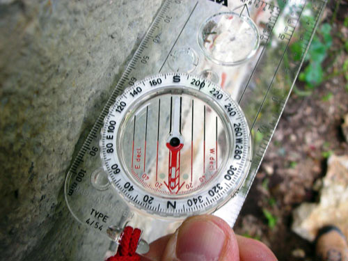 – Đọc con số ghi trên vòng ngoài của la bàn, nằm trên cùng đường thẳng với mũi tên trên thước nhựa.