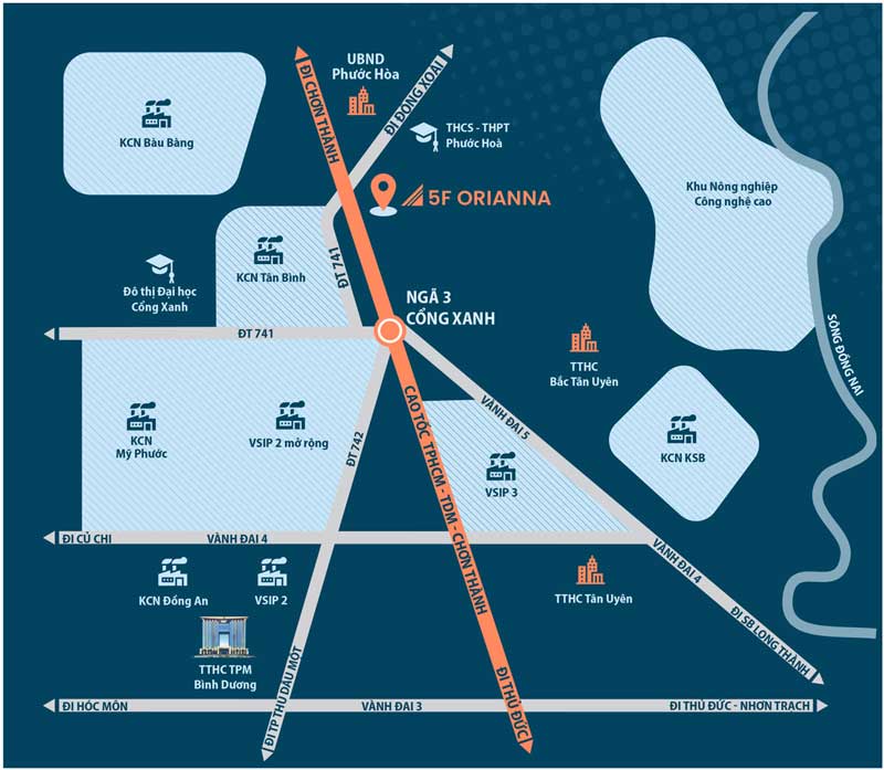 Cụ thể, 5F Orianna liền kề một loạt khu công nghiệp lớn gồm Tân Bình 1.000ha, VSIP 2 mở rộng 1.700ha, VSIP 3 hơn 1.000ha, đô thị đại học Cổng Xanh 630ha... Đây chính là khu vực đang thu hút làn sóng đầu tư mạnh mẽ nhất của Bình Dương, tạo cơ hội vươn tầm bứt phá cho Phú Giáo nói chung, 5F Orianna nói riêng.